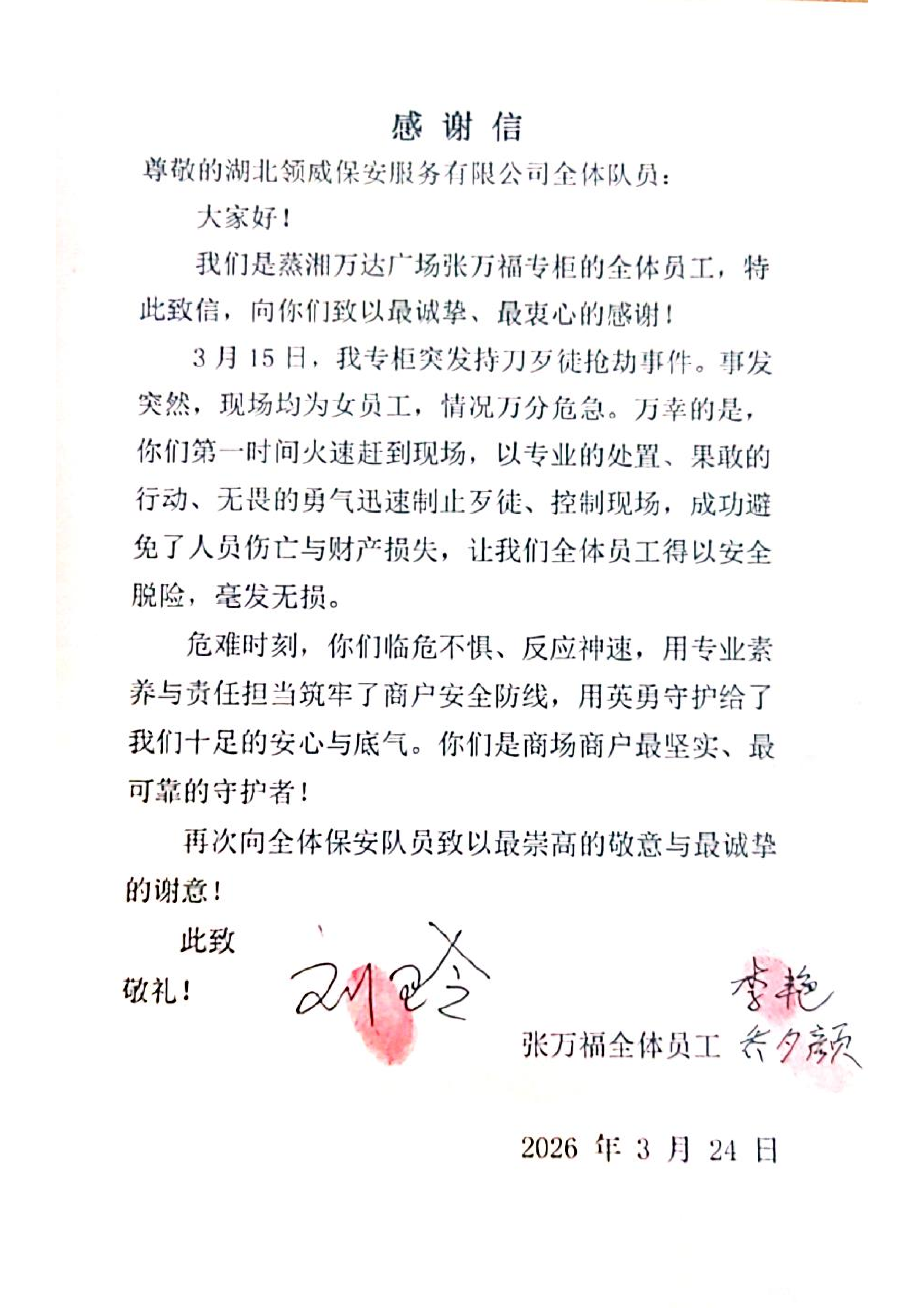 近日,湖北領(lǐng)威保安服務(wù)有限公司收獲一份特殊榮譽(yù)--由湖南衡陽(yáng)蒸湘萬(wàn)達(dá)廣場(chǎng)張萬(wàn)福珠寶專柜專程送來感謝信與錦旗,致謝領(lǐng)威安保隊(duì)員聯(lián)合警方快速處置持刀搶劫突發(fā)事件、全力守護(hù)商戶生命財(cái)產(chǎn)安全的英勇之舉與責(zé)任擔(dān)當(dāng)。